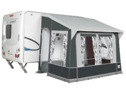 Een tarp met een extra sterke pees voor de caravanrails. Deze tarp is snel en eenvoudig te bevestigen aan de caravan en kan ook opgerold vast worden gezet aan de caravan/camper. Daarnaast kan deze tarp ook los worden opgezet door middel van de zeilogen in de tarp en de meegeleverde scheerlijnen en haringen. Is waterdicht door de PU coating met een waterkolom van 2000 mm. Inclusief handige draagtas.
