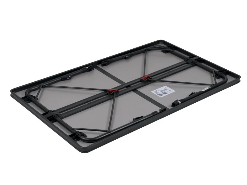 Een zeer stabiele tafel van hoge kwaliteit. Dankzij de speciale constructie is deze tafel eenvoudig in- en uit te klappen. Daarnaast zijn de poten na het inklappen stevig te bevestigen in de geleide aluminium rails aan de onderzijde van het tafelblad. Het tafelblad is extra ruim zodat deze plaats biedt tot 6 personen. De aluminium rails aan de onderzijde van deze campingtafel zorgt eveneens voor extra versteviging. De hoogwaardige materialen en het hittebestendige en watervaste tafelblad zorgen voor een lange levensduur. De poten bieden een hoge stabilteit door de dikke (28 mm) en extra verstevigde buizen. De stabilisatie voetjes zorgen voor extra grip op iedere ondergrond. Deze tafel is licht van gewicht door het aluminium frame.